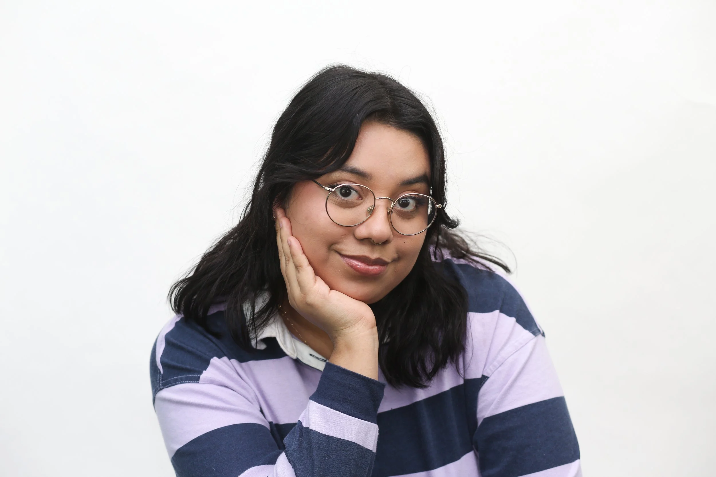 A young woman with black hair and glasses smiling, resting her head on her hand, wearing a striped long-sleeve shirt, against a plain white background.