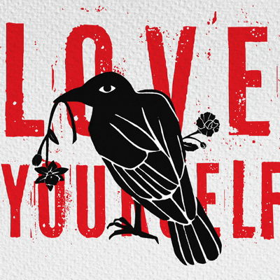 Black silhouette of a person with three pink abstract shapes overlaid.