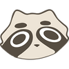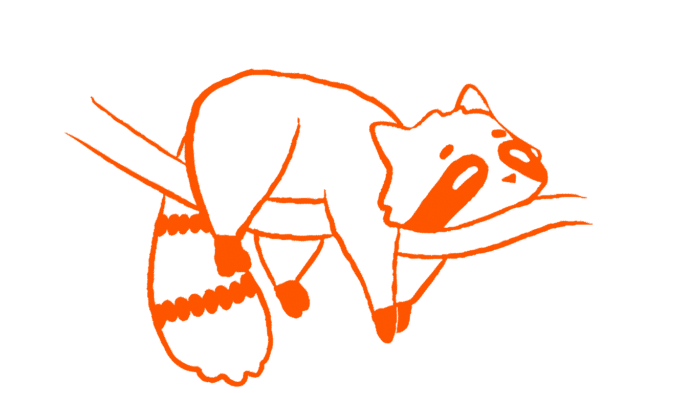 Outline illustration of a raccoon with its eyes closed, sitting on its hind legs with its arms extended forward, drawn in orange lines with black background.